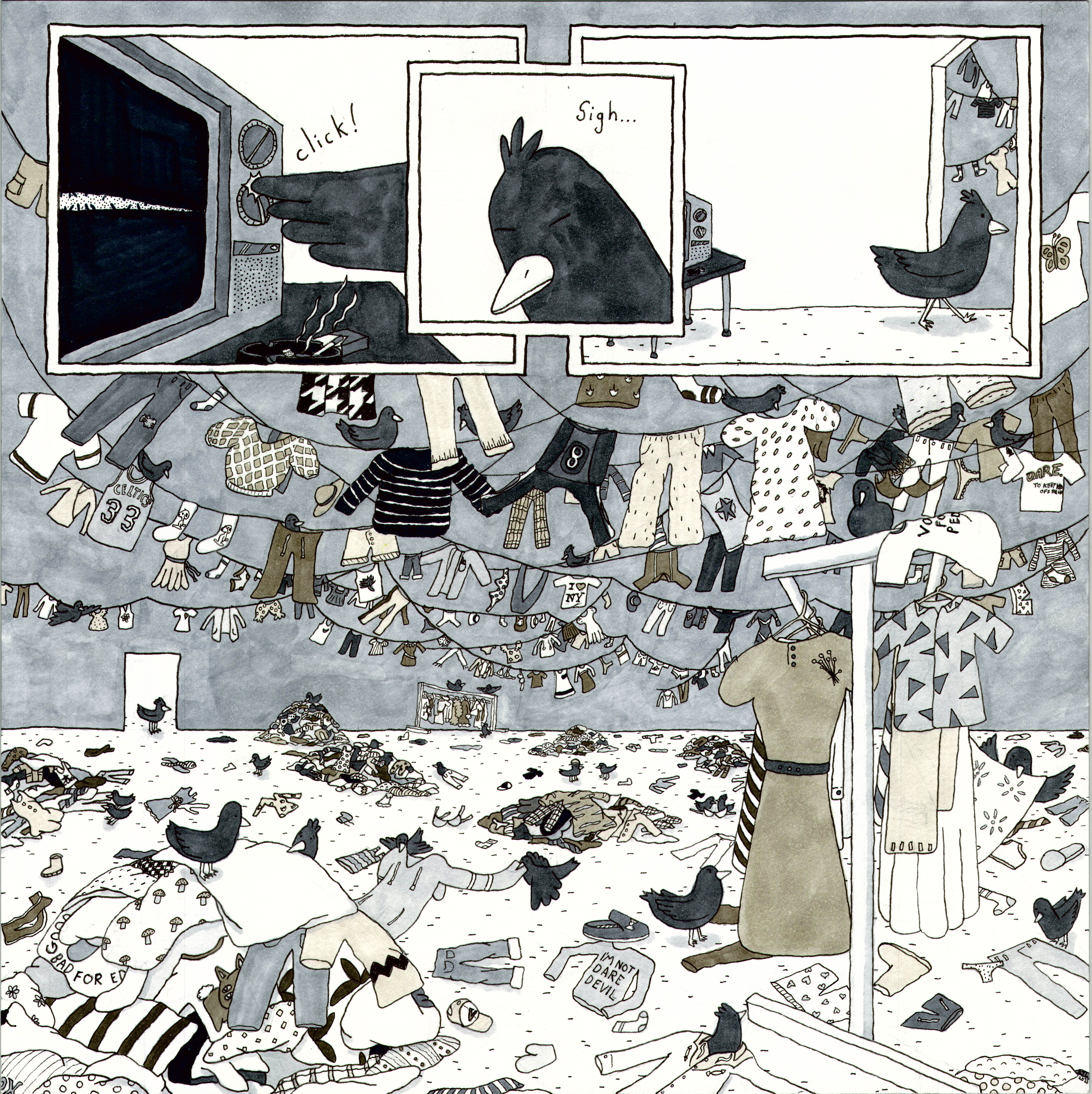 [0:11:36] BB: I'm looking at one of your comics right now that is Bird Laundry Thieves. And I was immediately drawn to it because it's like an illustrated background, but then these panels in the foreground and up top. And so I'm going to try and describe it for our audience, for our fans out there. In the top panels, there's the image of a black wing looking like it's clicking off an old-timey TV set. And then a center image of the bird's head kind of angled down with the eyes closed saying, "Sigh." And then the bird walking out of the room. And then there's just this chaos outside. Or it's not even outside. It's in some sort of space.